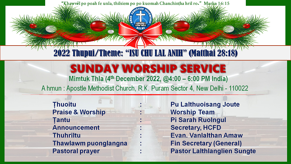 Chairman: Pu Lalthuoisang Joute Tantu: Pi Sarah Ruolngul Thuhriltu: Evan. Vanlalthlan Amaw Pastoral Prayer: Pastor Lalthlanglien Sungte
