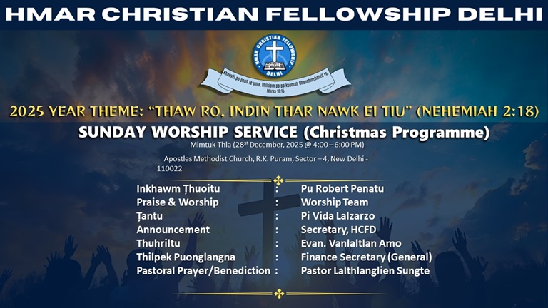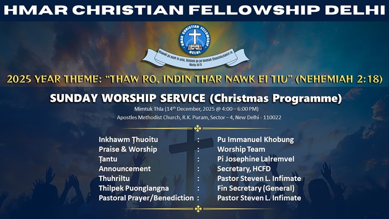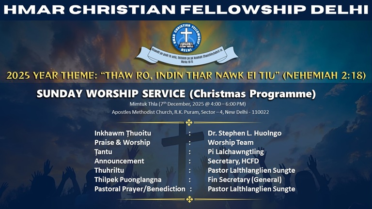 Apostel Methodist Church RK Puram, Sector 4, South Delhi, New Delhi, IndiaSunday Worship Service Țhuoitu : Dr. Stephan L. Huolngo Praise & Worship : Worship Team Țantu : Pi Lalchawngtling Announcement : Secretary, HCFD Thuhriltu : Pastor Lalthanglien Sungte Thawlawm Puonglangna […]