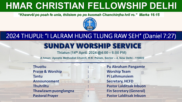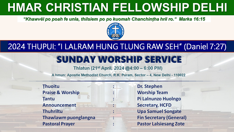 SUNDAY WORSHIP SERVICE Chairman: Dr Stephen Tantu: Pi Lalnunzo Huolngo Thuhriltu: Upa Samuel Songate Pastoral Prayer: Pastor Lalsiesang Zote