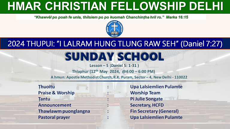 Sunday School Lesson 5 (Daniel 5:1-31) Thuoitu: Upa Lalsiemlien Pulamte Tantu: Pi Julie Songate Pastoral Prayer: Upa Lalsiemlien Pulamte