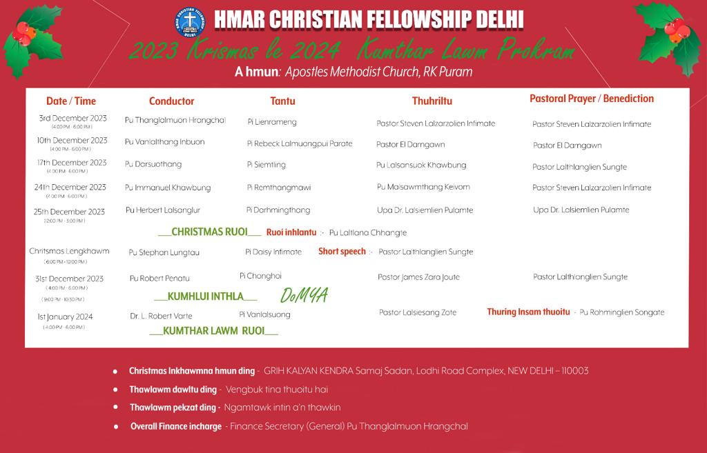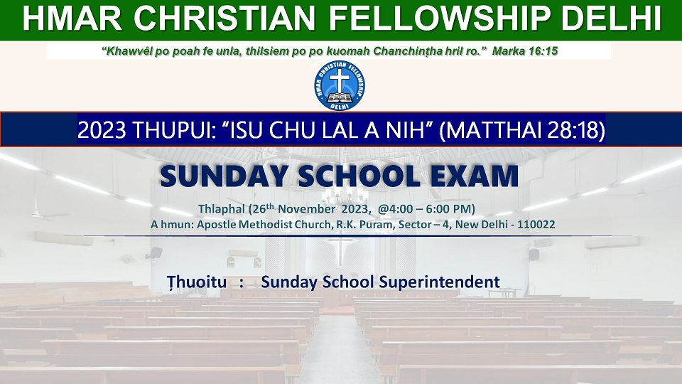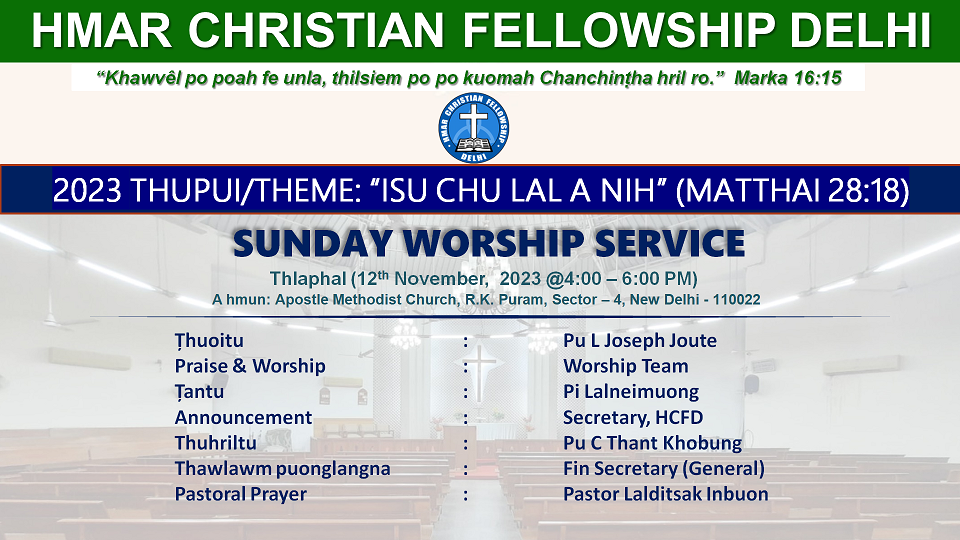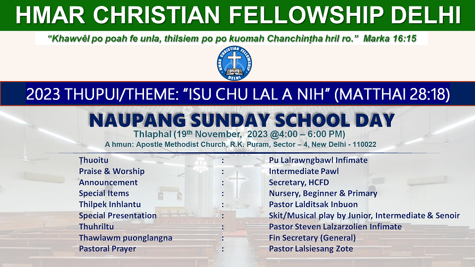 Thuoitu: Pu Lalrawngbawl Infimate Hla Thuoitu: Intermediate Pawl Thupuong: Secretary, HCFD Special Items: Nursery, Beginner & Primary Thawlawm Dawlna: Usher Thawlawm Inhlantu: Pastor Lalditsak Inbuon Special Presentation: Skit/Musical/Play by Junior, […]