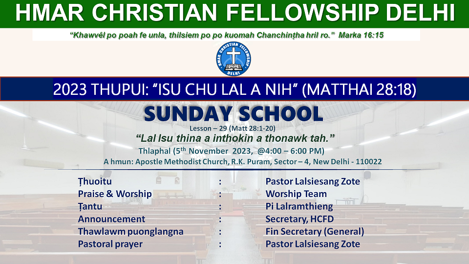 Sunday School  Lesson -  29 "Lal Isu thina a inthokin a thonawk tah." Matthai 28: 1-20   Thuoitu: Pastor Lalsiesang Zote Tantu: Pi Lalramthieng Pastoral Prayer: Pastor Lalsiesang Zote