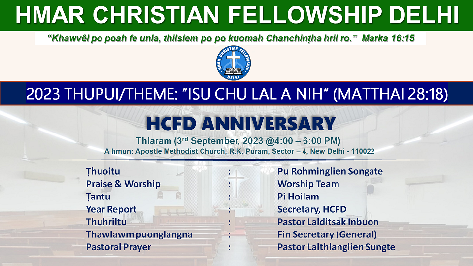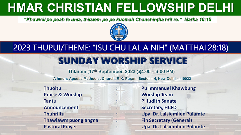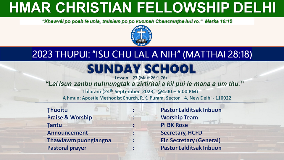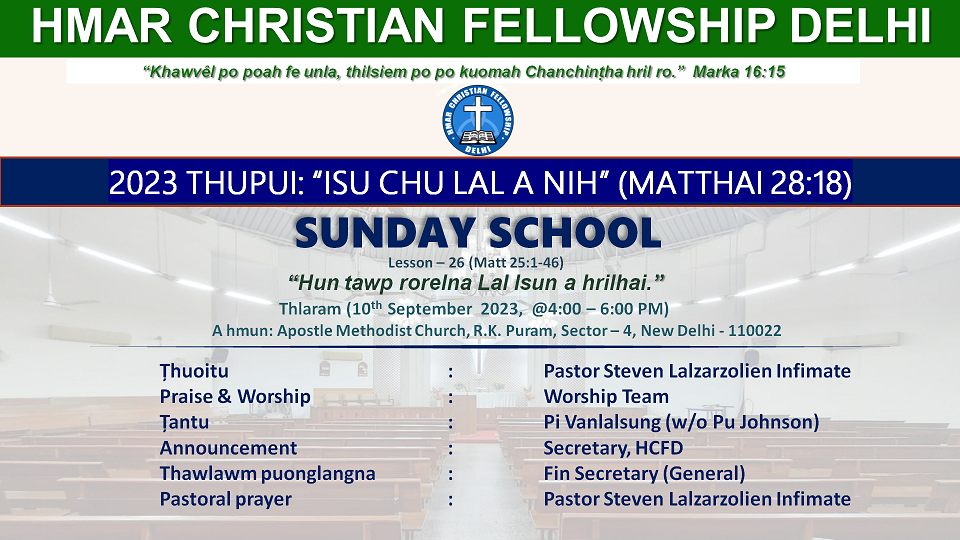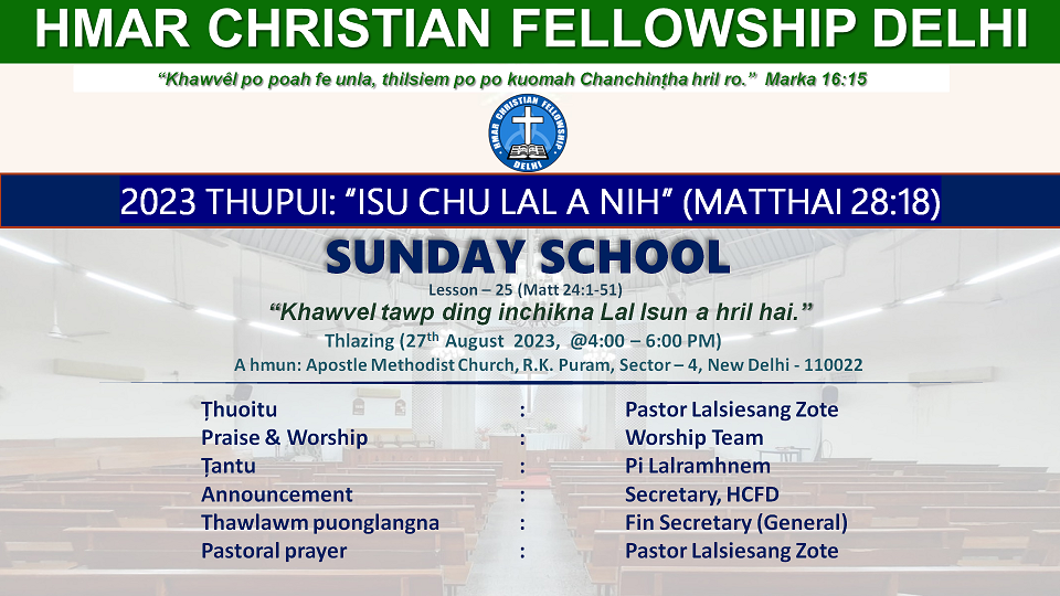 Apostel Methodist Church RK Puram, Sector 4, South Delhi, New Delhi, IndiaSunday School Lesson - 25 "Khawvel tawp ding inchikna Lal Isun a hril hai." (Matthai 24: 1-51) Thuoitu: Pastor Lalsiesang Zote Tantu: Pi Lalramhnem Pastoral Prayer: Pastor Lalsiesang Zote