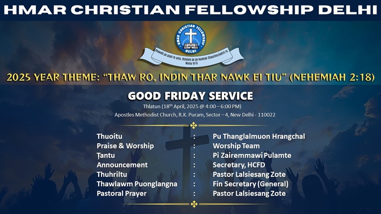 Good Friday Service Thuoitu    : Pu Thanglalmuon Hrangchal Praise & Worship : Worship Team Tantu : Pi Zaireammawi Pulamte Announcement : Secretary, HCFD Thuhriltu : Pastor Lalsiesang Zote Thilpek Puonglangna […]