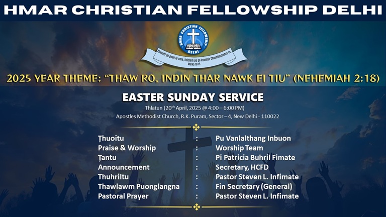 Easter Sunday Service Thuoitu    : Pu Vanlalthang Inbuon Praise & Worship : Worship Team Tantu : Pi Patricai Buhril Fimate Announcement : Secretary, HCFD Thuhriltu : Pastor Steven L. Infimate […]
