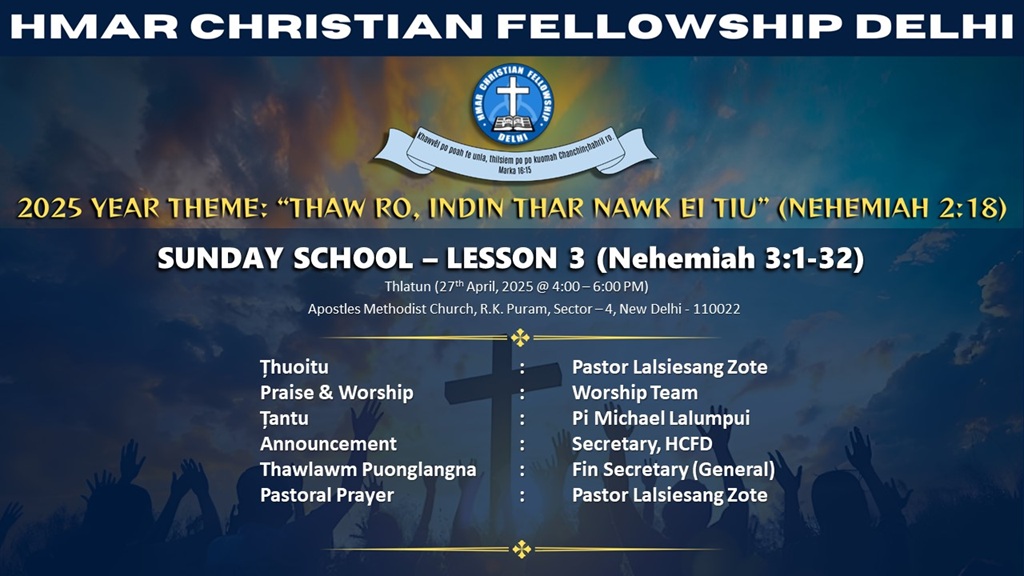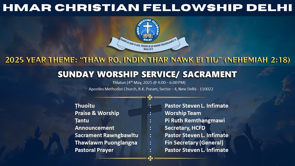 SACRAMENT SERVICE Țhuoitu : Pastor Steven L. Infimate Praise & Worship : Worship Team Țantu : Pi Ruth Remthangmawi Announcement : Secretary, HCFD Thuhriltu : Pastor Steven L. Infimate Thawlawm […]