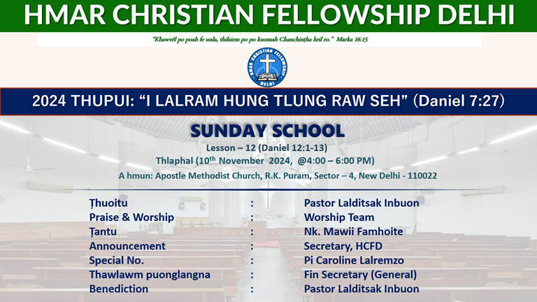 Bible Study Lesson-12, Daniel 12:1-13 Thuoitu: Pastor Lalditsak Inbuon Tantu: Nk. Mawii Famhoite Special no: Pi Caroline Lalremzo Pastoral Prayer: Pastor Lalditsak Inbuon