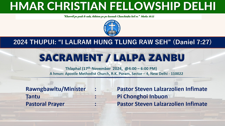 Sacrament Service / Lalpa Zanbu Rawngbawltu:Pastor Steven Lalzarzolien Infimate Tantu: Pi Chonghoi Inbuon Benediction: Pastor Steven Lalzarzolien Infimate