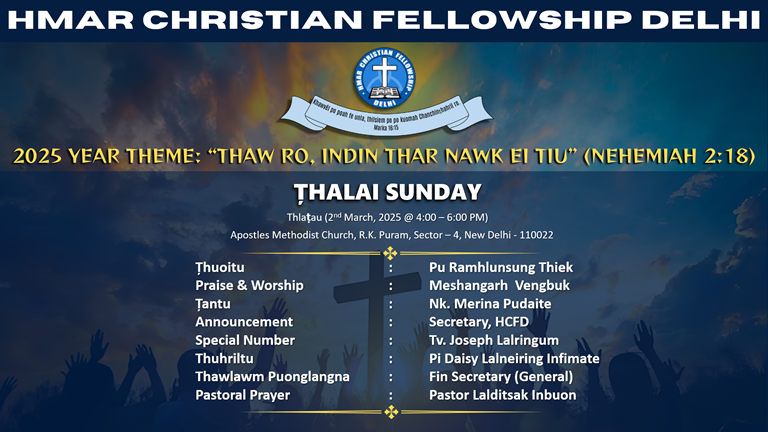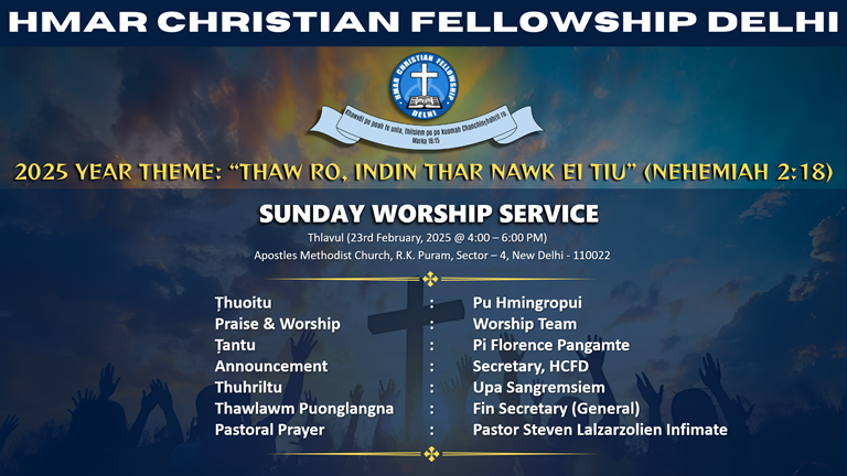 Sunday Worship Service (23rd February 2025 @4:00 PM India) Țhuoitu : Pu Hmingropui Praise & Worship : Worship Team Țantu : Pi Florence Pangamte Announcement : Secretary, HCFD Thuhriltu : […]
