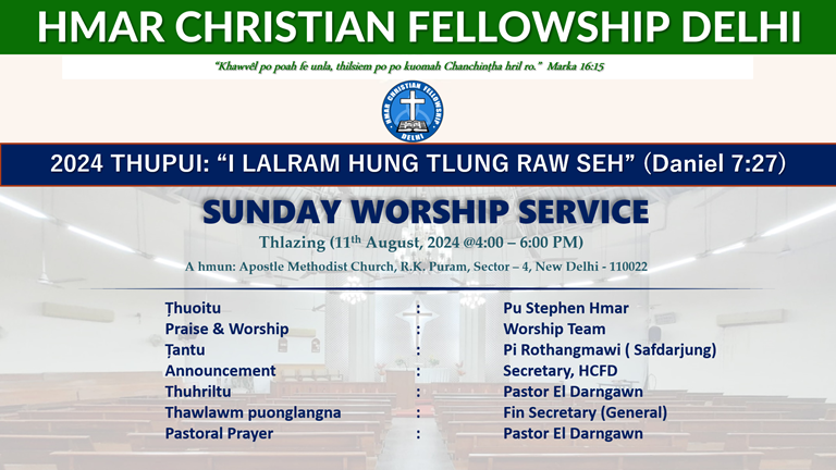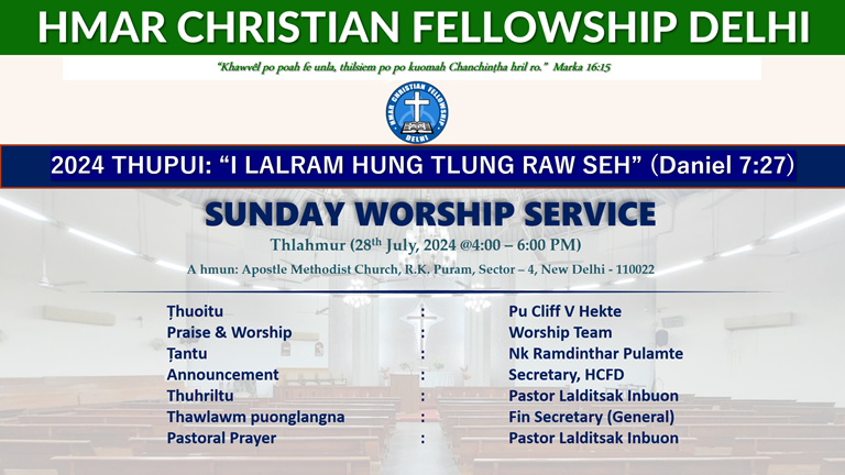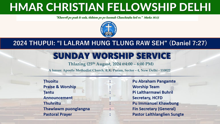 Sunday Worship Service Chairman: Pu Stephen Hmar Tantu: Pi Rothangmawi ( Safdarjung) Thuhriltu: Pastor El Darngawn Pastoral Prayer: Pastor El Darngawn