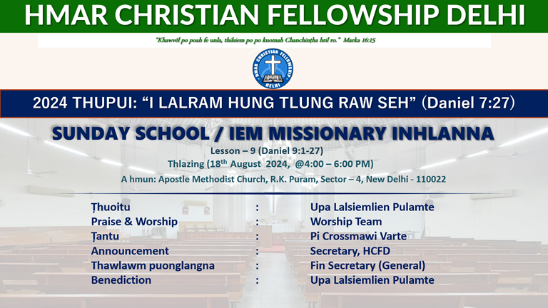 Sunde Skul le IEM Missionary Inhlanna Lesson-9 (Daniel 9:1-27) Thruoitu: Upa Lalsiemlien Pulamte Tantu: Pi Crossmawi Varte Benediction: Upa Lalsiemlien Pulamte