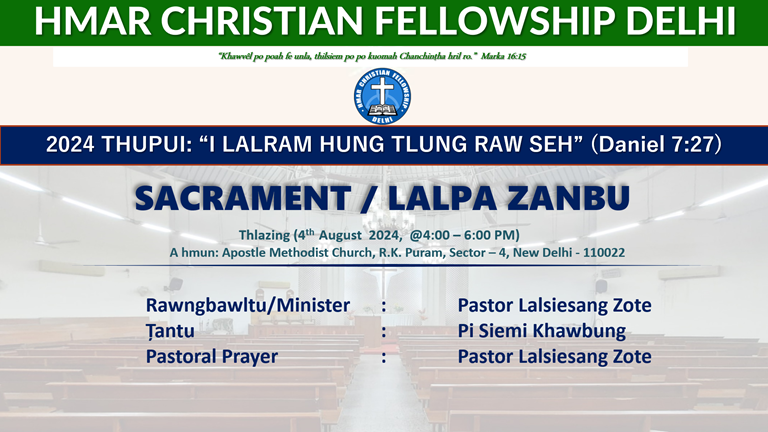 Sacrament Rawngbawltu/Minister: Pastor Lalsiesang Zote Tantu: Pi Siemi Khobung Pastoral Prayer: Pastor Lalsiesang Zote