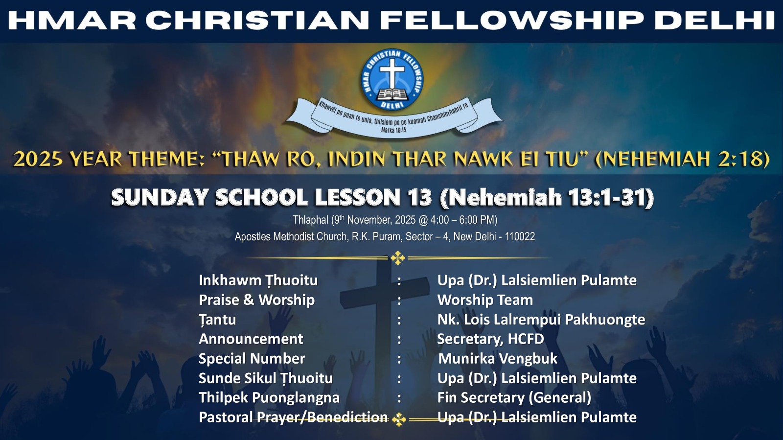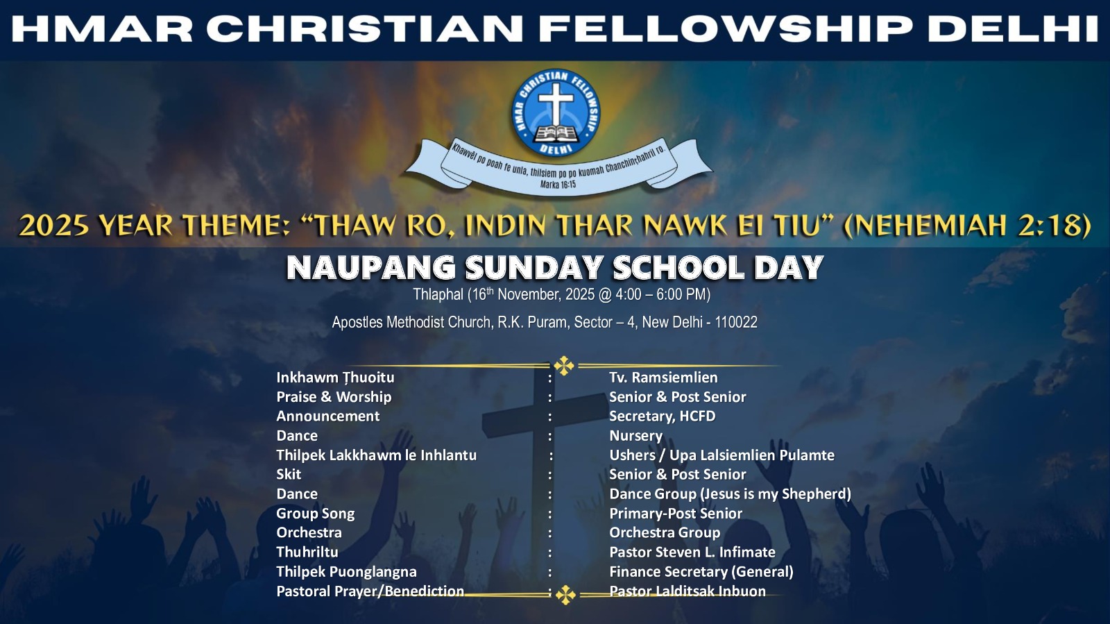 Apostel Methodist Church RK Puram, Sector 4, South Delhi, New Delhi, IndiaSunday Worship Service Țhuoitu : Pu C Thant Khawbung Praise & Worship : Worship Team Țantu : Nk. Jubilee Lalrammawi Special No.: Meshangarh Vengbuk Announcement : Secretary, HCFD Thuhriltu : […]