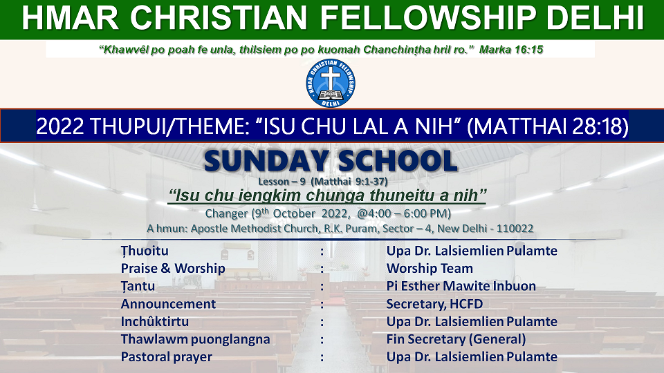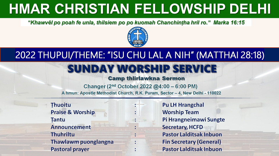 Apostel Methodist Church RK Puram, Sector 4, South Delhi, New Delhi, IndiaChairman: Pu Vanlalthang Inbuon Tantu: Pi Kezia Khawbung Thuhriltu: Pu Malsawmthang Keivom Pastoral Prayer: Pastor Steven Lalzarzolien