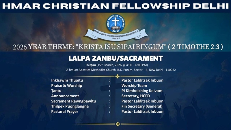 SACRAMENT SERVICE Țhuoitu : Pastor Lalditsak Inbuon Praise & Worship : Worship Team Țantu : Pi Kimhoiching Keivom Announcement : Secretary, HCFD Thuhriltu :Pastor Lalditsak Inbuon Thawlawm Puonglangna : Fin […]